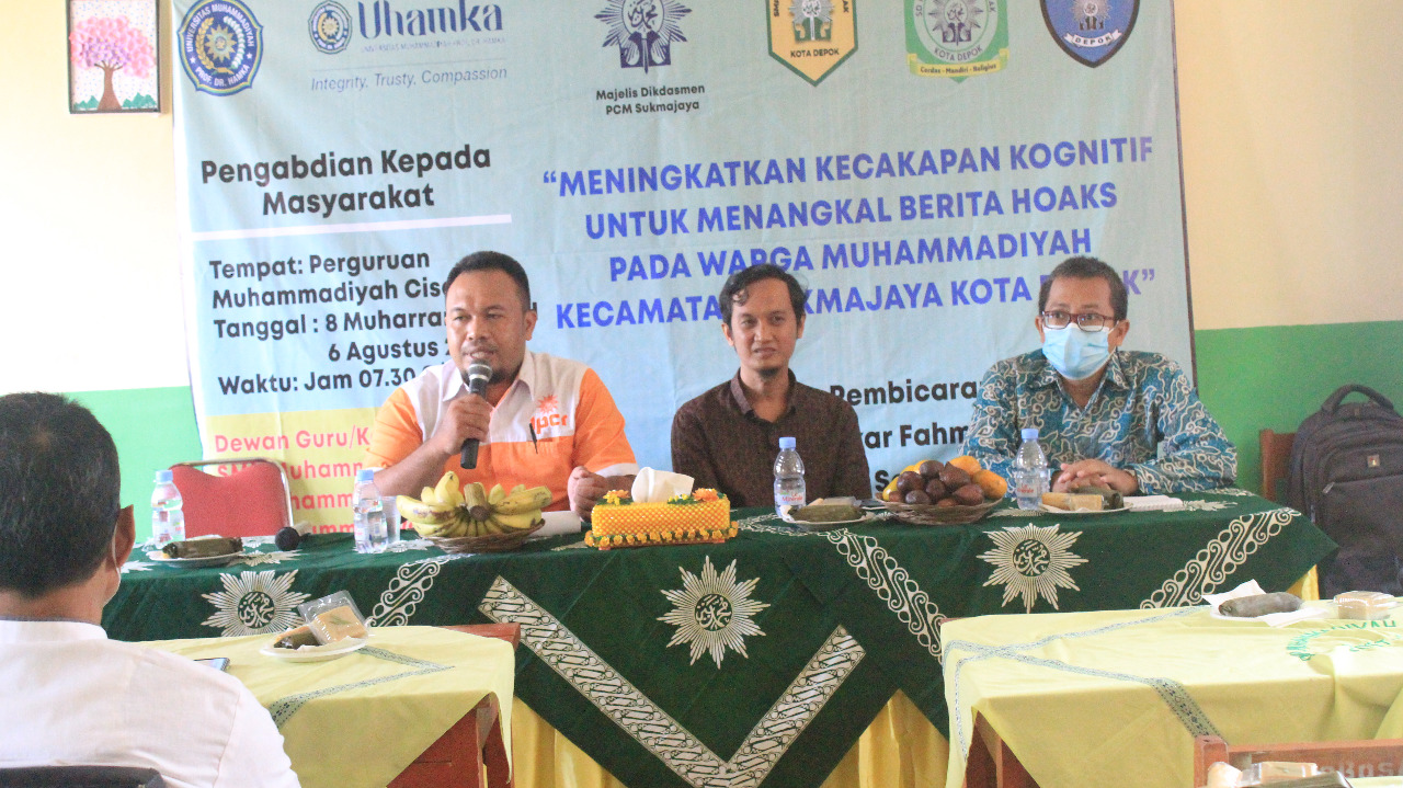 Seiring dengan penyebaran pandemi COVID-19 di dunia, terjadi penyebaran informasi yang berlangsung secara cepat di masyarakat yang disebut dengan infodemik. Sayangnya, informasi tersebut ada yang akurat ada yang tidak, sehingga menyulitkan orang untuk menemukan sumber informasi yang dapat dipercaya. Data dari Kemkominfo per Juli 2022 menyebutkan, terdapat 2.205 temuan berita hoaks mengenai Covid-19 di media sosial dengan sebaran berita hoaks sebanyak 6.195. Untuk menangkal penyebaran berita hoaks di masyarakat, dosen Psikologi Universitas Muhammadiyah Prof Dr Hamka (UHAMKA) Jakarta bekerja sama dengan Pimpinan Cabang Muhammadiyah Kecamatan Sukmajaya Kota Depok mengadakan kegiatan pengabdian masyarakat dengan berbagi kiat menangkal berita hoaks untuk para guru dan tenaga kependidikan yang diselenggarakan di SMP Muhammadiyah Cisalak, Kota Depok, Sabtu (6/08/2022).